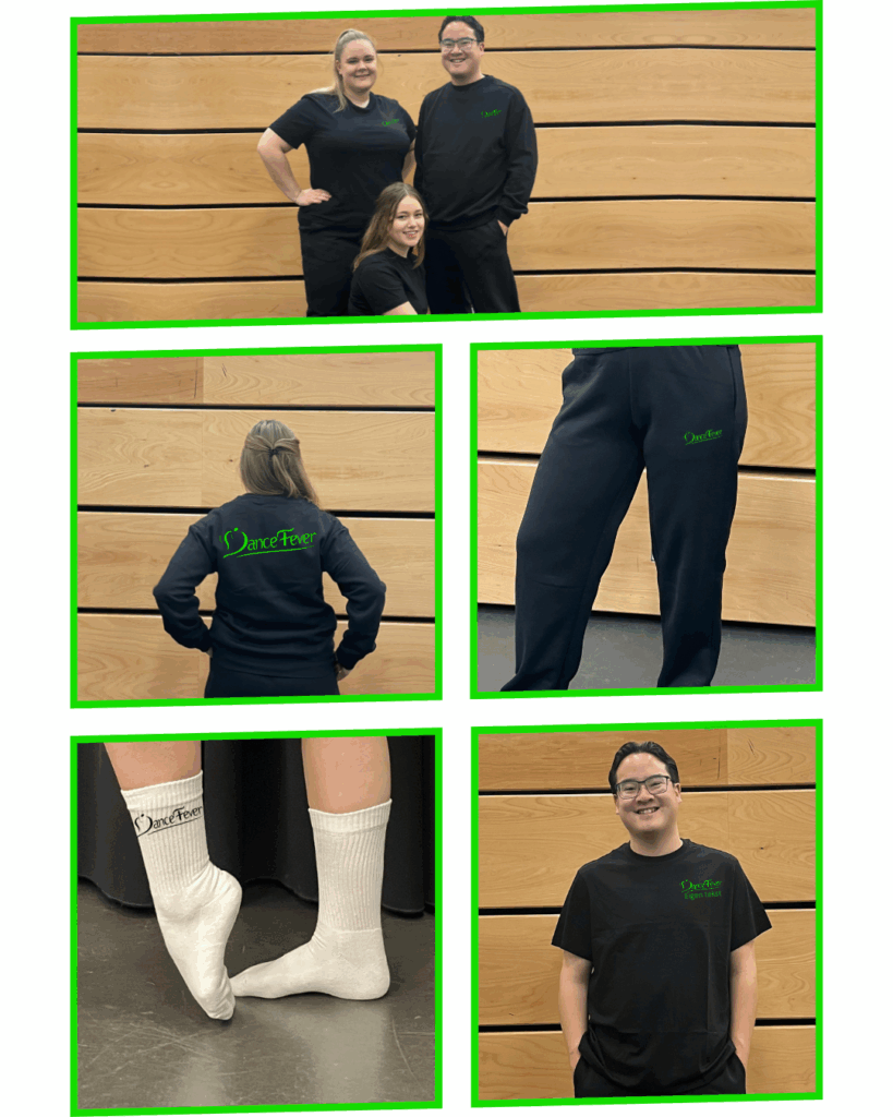 Member clothing can be ordered again! We have black T-shirts, black sweatshirts, black sports joggers, and white socks available to order, which will be printed with the Dance Fever logo and, if desired, your name (on the shirt and sweatshirt).